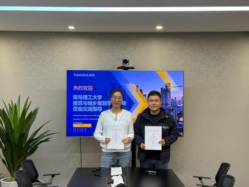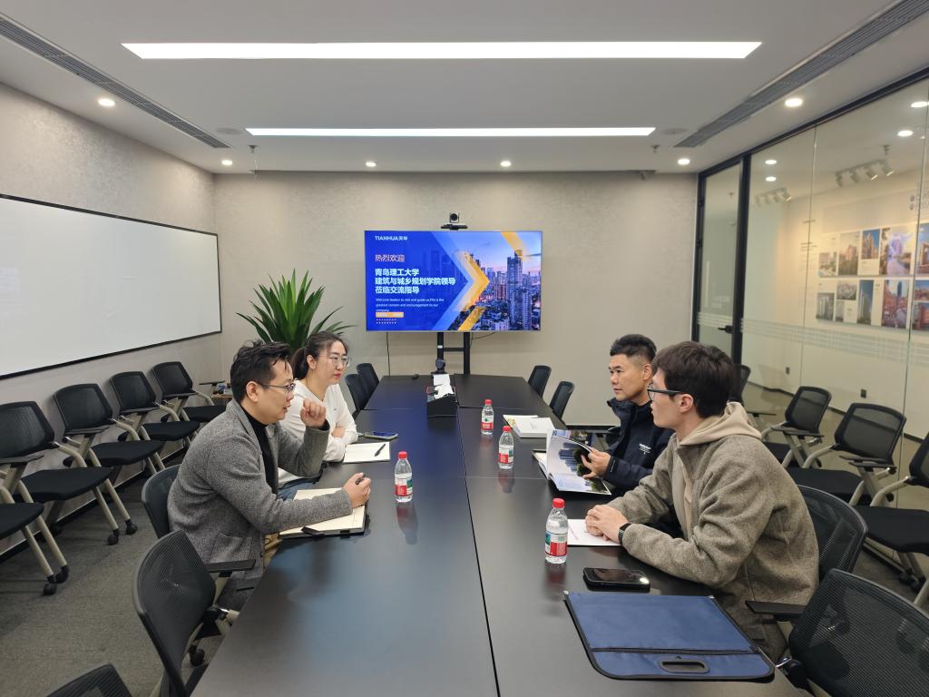 青岛天华易境建筑设计有限公司总经理助理王茜茜、人事经理刘海健对王中帅一行到访表示热烈欢迎。王茜茜系统介绍了公司的发展历程、核心业务领域及未来战略规划。她指出,随着公司在城市更新、数字化设计等领域的持续深耕,项目体量不断扩容,对具备扎实专业基础、较强实践能力和创新意识的高素质设计人才需求日益增长。并表示,期待与学院建立常态化合作机制,在人才输送、研究生联合培养、科研项目共研、技术成果转化等方面探索新模式,实现资源共享、优势互补,共同服务区域城市建设与行业高质量发展。