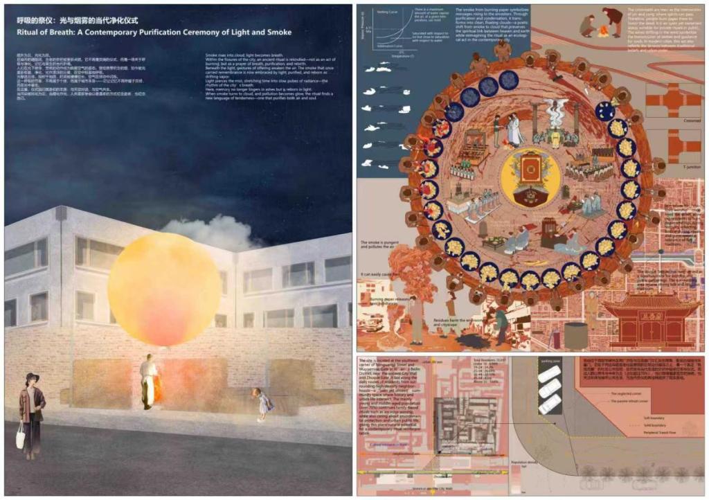 由我校建筑与城乡规划学院朱思颖、张浚烽同学设计,沈祺老师指导的作品《呼吸的祭仪:光与烟雾的当代净化仪式》,作品聚焦西安老城区街角闲置空间,以“转化”为核心策略,将传统焚纸行为从污染性活动升华为一套融合生态净化、公共参与精神延续的“轻介入”装置。该作品不仅精准回应当下城市微更新与生态可持续的现实议题,更在方法论层面巧妙融汇了传统祭祀文化与当代技术理念,展现出卓越的跨学科创新设计能力,收到评审专家的一致赞许,作品最终入围前四强,获得二等奖。