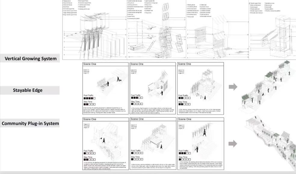 由我校与韩国建国大学、武汉工程大学、西南交通大学联合设计作品《拾阶而上》(设计者:于远昊、张奕婷、张梦玮、马楚涵,指导教师:张珺琢),其着眼于城市中被忽视的楼梯旁边角空间,通过合理的改造与精准的功能植入,意图将社会中与环境脱节、利用率低下的消极区域,转变为兼具实用价值与人文关怀的社区活力点,项目以服务于周边多样化的使用人群为出发点,收到专家们的一致认可,最终获得三等奖。两项获奖作品充分体现了我校建筑学学子对社会空间的深刻思考与研究,以富有创见的建筑学语言,对当代城市问题作出了卓有成效的回应。