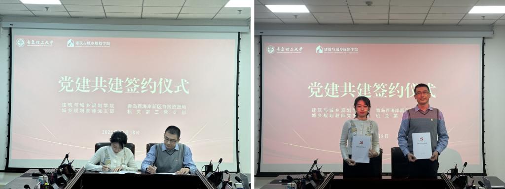 与会人员在综合服务中心301会议室举行党建共建签约仪式。吕楠对青岛西海岸新区自然资源局一行的到来表示热烈的欢迎,从党建工作、师资队伍、专业设置、科研平台等方面对学院进行了全面介绍。她表示,此次党建共建是校地资源互补、优势协同的有效途径,期待通过党建共建实现学术研究与国土空间规划等实践业务的双向赋能,共同探索党建业务融合发展新路径。青岛西海岸新区自然资源局党组成员、区综合服务保障中心主任宗德见介绍了单位的基本情况,重点分享了近年来机关党支部在党建机制创新、党建业务融合和党员教育培养等方面的工作成效。他表示,希望双方以支部共建为契机,深入推进党建引领、互促互联,在更广领域、更深层次实现优势互补、协同创新。