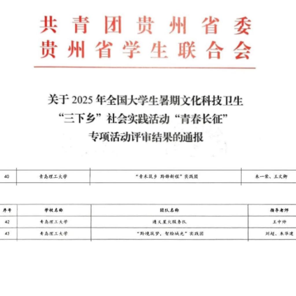 近日,省委宣传部、省文明办、省教育厅、团省委、省学联联合印发了《关于2025年贵州省大学生暑期文化科技卫生“三下乡”社会实践活动评审结果的通报》,建筑与城乡规划学院申报的3个实践团队全部荣获省级“优秀实践团队”,充分彰显了学院在“三下乡”社会实践工作中的突出表现与育人成效。