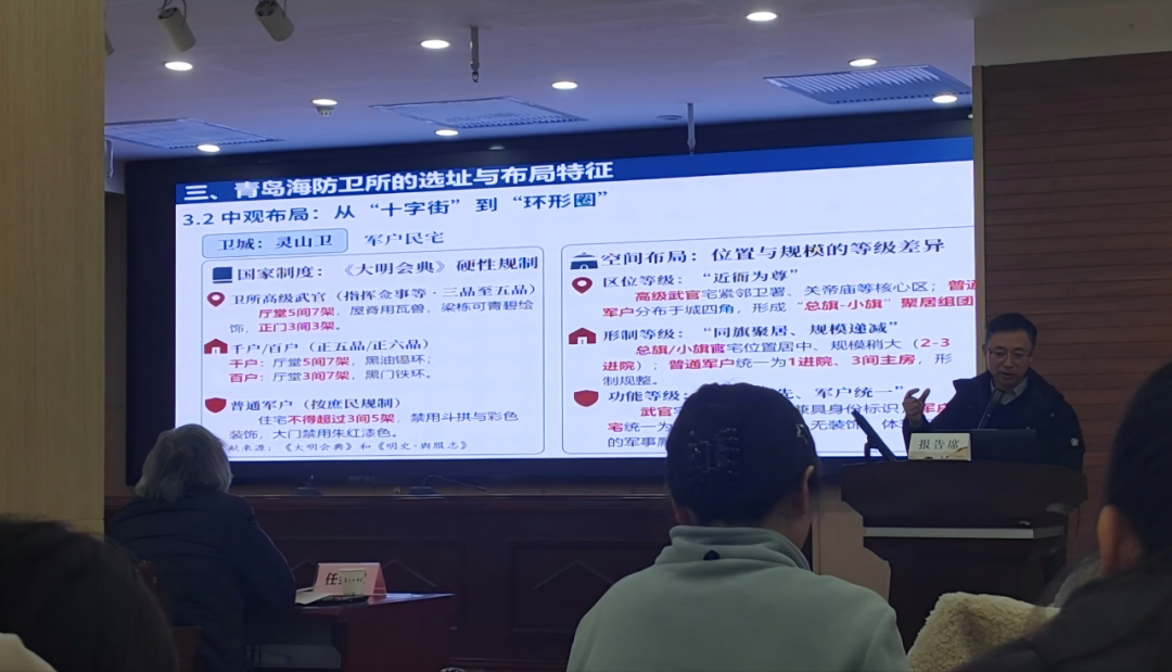 交流报告环节邀请七位专家分享乡村振兴与乡村规划建设研究和实践成果。我校朱一荣教授以山东胶东地区为例,介绍了明代海防卫所(卫、所、巡检司)的军事防御体系、选址特点和历史演变。以灵山卫、雄崖所等为例,展示了其空间格局与建筑等级制度。报告指出,尽管这类卫所村落具有重要的历史与文化价值,且在保护规划与风貌改善方面取得进展,但仍普遍面临空心化严重、居民自建与保护要求冲突、跨区域协调困难以及保护规划难以落地等现实挑战。