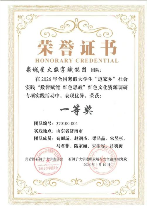 近日,由共青团石河子大学委员会、石河子大学边疆发展与安全治理研究院主办的2026年全国寒假大学生“返家乡”社会实践“数智赋能 红色思政”红色文化资源调研专项活动结果揭晓,我院“泉城星火数字赋能团”表现突出,荣获全国一等奖。