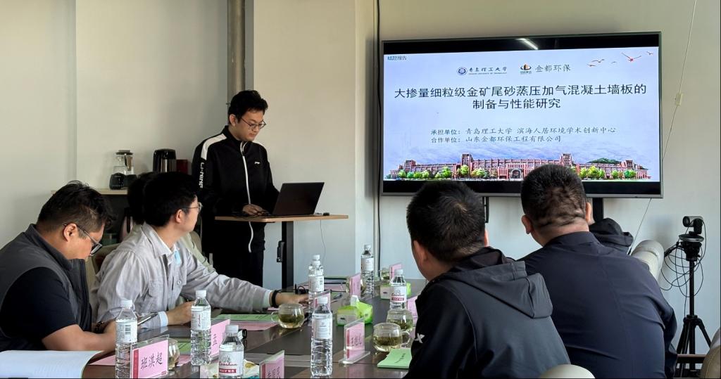 10月14日,建筑与城乡规划学院教师产学研合作项目《大掺量细粒级金矿尾砂蒸压加气混凝土墙板的制备与性能研究》课题结题报告会在市北校区滨海人居环境学术创新中心305会议室圆满举行。来自山东金都环保工程有限公司和学校的专家、教师和研究生齐聚一堂,共同见证这一阶段性成果的诞生。