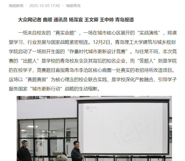 【大众网·青岛】青岛理工大学建筑与城乡规划学院:校友出题,学生“真题真做”,设计实践链接国家战略与青春智慧